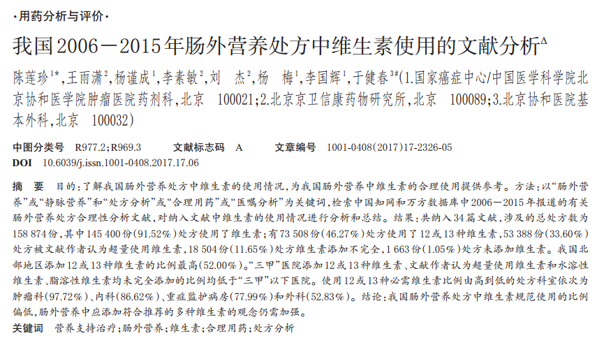 由中国医学科学院肿瘤医院陈莲珍主任药师执笔,北京协和医院基本外科于健春教授为通讯作者的学术论文——《我国2006-2015年肠外营养处方中维生素使用的文献分析》发表在《中国药房》杂志2017年第28卷第17期上。2017年10月14日,此文章被评为2017年度“齐鲁杯”《中国药房》杂志药事管理优秀论文奖。